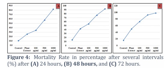 Additionally, S. alba nanoparticles were tested at concentrations of 100 µg/ml, 500 µg/ml, and 1000 µg/ml to assess juvenile mortality over different time intervals (24, 48, and 72 hours). The nanoparticle concentrations showed increasing mortality rates: after 24 hours (34.5%, 57.8%, and 82.2%), 48 hours (54.5%, 76.5%, and 92.2%), and 72 hours (72.5%, 92.5%, and 98.3%) at 100 µg/ml, 500 µg/ml, and 1000 µg/ml, respectively (Fig. 4).