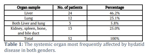 Results: According to our research, the liver was the organ that had hydatid cyst infections most commonly, with a damage frequency of 46.2%. According to the statistics, the prevalence of infection in the other organs, which were listed after the liver, was 25.0% (spleen, bone, and bile duct) and 23.1% cases were of lung infection. It was found that the likelihood of liver and lung injuries happening concurrently was the lowest (5.8%) of all the infections.
