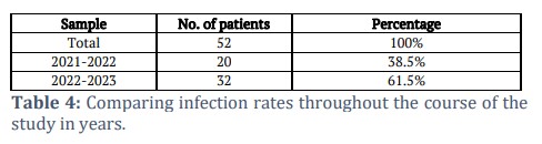 Finally, the study period reveals a sharp increase in infection rates from 2021 to 2023. During 2021–2022, 38.5% of cases (20 patients) were recorded, but in 2022–2023, the number of infections surged to 61.5% (32 patients). This substantial rise highlights the growing prevalence of hydatid disease over the course of the study (Table 4).