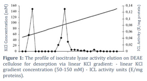 A special purification pattern was developed for obtaining highly-purified isocitrate lyase specimens, which included 4 stages. All the operations were carried out at 0-4°C temperature according to Scherbyna et al., [10]: