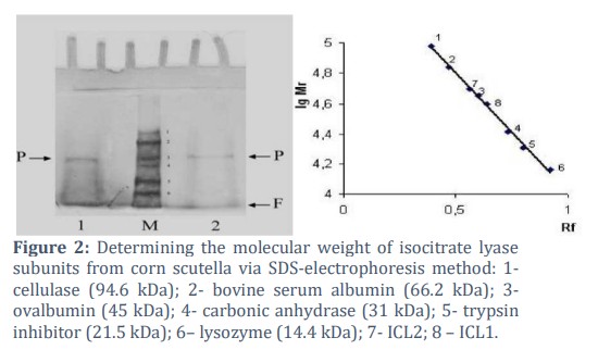 During the gel chromatography on Sephadex G-200, ICL from corn scutella was eluted as two peaks corresponding to molecular weights of 164 and 208 kDa. Electrophoretic analysis of proteins in the presence of SDS allowed determination of the molecular weight of each subunit, which was 43±1.2 kDa for ICL1 and 48±0.5 kDa for ICL2 in Figure 2.