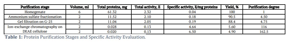 Standard marker proteins (Sigma) were used to plot the calibration curve [13]. The testing was done in three replications. Analytical evaluation for each sample was carried out in two replications. Typical experiment data are presented in the table and the figures, where each value represents the arithmetic mean. The statistical Student’s criterion was used for mathematical treatment [14].