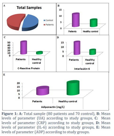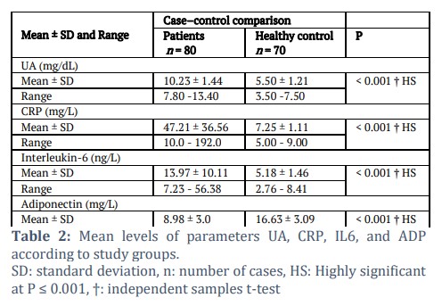 Results: On analysis, 80 out of the 150 individuals had gout arthritis. Uric Acid, IL-6, and CRP concentrations were all noticeably more prevalent in patients than in the control group (P < 0.001). Furthermore, ADP levels in patients were considerably lower than those of the control group (P < 0.001) as well. The present results were examined for age, gender, and body mass index (BMI).
