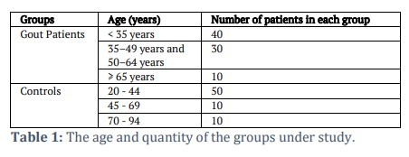 The investigation included the collection of 150 samples from Al-Hussein Teaching Hospital and specialty clinics, Thi-Qar, Iraq, from August 2021 until September 2022 (80 for patients with gout and 70 for controls). The age range for participants was 20-94 years in each group. For the diagnosis of the presence of gout among patients, blood samples of 150 individuals were collected, 80 of whom were diagnosed with gout and 70 were not. Every participant had a comprehensive clinical examination. Table 1 lists the participants' ages and numbers.