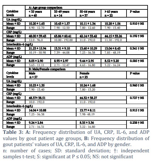 Methods: ELISA was used to determine the clinical, laboratory, and cytokine levels of 80 male and female gout patients (gout group). The study also included 70 individuals without a history of arthritis for comparison.