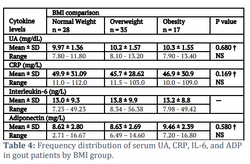 As shown in Table 4, slightly increased levels of sUA in obese people were observed relative to other categories, with a probability value, P = 0.680. Additionally, average serum CRP values were 49.9 ± 31.09 mg/L, 45.7 ± 28.62 mg/L, and 46.9 ± 30.9 mg/L. In comparison among normal weight, overweight, and obese patients, the highest mean values were seen in normal weight patients when compared with those in other categories. The difference was not statistically significant (P = 0.169). For IL-6, the mean levels were 13.0 ± 3.33 ng/L, 13.8 ± 3.05 ng/L, and 13.2 ± 2.11 ng/L. In patients who were normal weight, overweight, and obese, the mean values were greater in the overweight patients than in the other groups. However, the difference (P = 0.566) was not statistically significant. While the average serum levels of ADP were 8.62 ± 2.80 mg/L, 8.63 ± 2.69 mg/L, and 9.46 ± 2.39 mg/L in individuals who were normal weight, overweight, and obese, respectively, the variance in mean levels across the groups was also not statistically significant (P = 0.580).