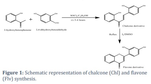 Results: Excellent yields of chalcone derivatives were obtained through Aldol condensation of 2-hydroxyacetophenone and 2,4-dihydroxybenzaldehyde using SOCl2/ETOH as a catalyst. In contrast, oxidative cyclization of the synthesized 2'-chalcone derivative in dimethyl sulfoxide (DMSO) with iodine affords the corresponding flavone derivatives.