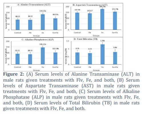 The mean values of the serum (AST), (ALT), and (ALP) activities in addition to total bilirubin (TB) concentrations of male rats treated with Flv, Fe, and their combination for 14 days were shown in Table 1 and Figures (2A-D). The serum AST, ALT, and ALP activities, in addition to serum TB concentrations, were shown to be considerably (p < 0.05) higher in the Fe-treated group compared to that of the control group. However, as compared to the Fe-treated group, the rat group treated with both Fe and Flv demonstrated a considerable (p < 0.05) drop in the activities of these enzymes and TB concentrations.