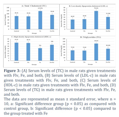 As depicted in Table 2 and Figures 3A-D, iron administration induced a state of dyslipidemia in male rats. The iron-treated group compared with the control group exhibited statistically significant (p < 0.05) increments in serum total cholesterol (TC), LDL-c, and triglycerides (TG). Correspondingly, there was a significant (p < 0.05) decline in HDL-c levels. Conversely, the lipogram in the flavone-only-treated rats was not significantly different (P > 0.05) from the control rats. Significantly, cotreatment with iron and flavone substantially suppressed the lipid defects, and significantly reduced levels of lipids (p < 0.05) were noted compared with the iron-only group.