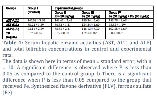 The point of this study was to find out how the synthesized flavone derivative (Flv) could protect animals' livers from damage caused by iron. The current work took into account the injury produced by iron by assaying the release of ALT and AST into the circulation [15,16]. Increased contents of blood ALT and AST were noted in the current work. This shows the damage to hepatocyte mitochondria by iron toxicity, causing oxidative stress. These elevated activities are most likely an indication of compromised liver membrane integrity, with leakage of damaged hepatocyte enzymes into the circulation [17]. Increased activities of serum alkaline phosphatase are a definitive marker of cellular injury resulting from impaired membrane function. Total bilirubin (TB) is a well-established marker of tissue injury by toxic chemicals, and in iron-treated rats, it was significantly elevated. The flavone product prepared in the current work, at 80 mg/kg dose, could potentially stabilize the damaged cellular membrane of injured liver and protect hepatocytes against iron toxicity, thereby decreasing leakage of the enzymes into the circulation. In reference, the citrus flavonoid compound, Hesperidin, with a protective function in the cellular membrane, has been established earlier [18].