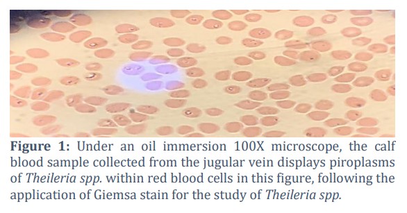 The microscopic examination was used to determine whether piroplasms were present. All sixteen blood samples taken from the calves gave a positive result due to the presence of piroplasms in the RBCs. Figure 1 shows the T. annulata under 100X oil immersion.
