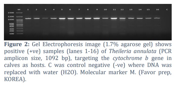 A 1092 bp fragment of the cytochrome b gene was used to detect the resistant gene of Theileria annulata in blood samples of calves, using the PCR test; C was the control (-ve), in which water (H2O) was added instead of DNA, as shown in Figure 2.