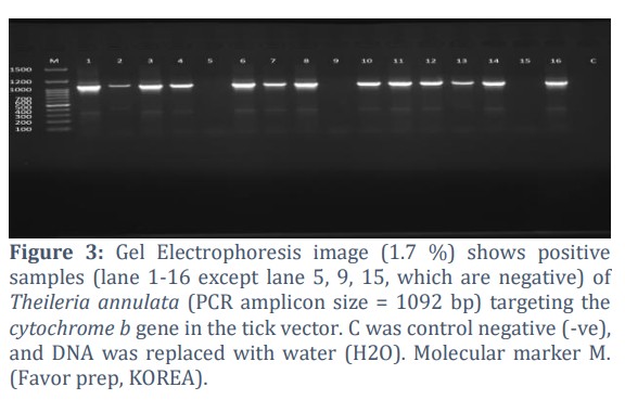 The cytochrome b gene was used on tick samples, a 1092 bp fragment, to detect the resistant gene of Theileria annulata in tick samples using PCR tests. C was control negative (-ve), in which water (H2O) was added instead of DNA. Figure 3 shows the positive result (1-16), except (5, 9, 15), which give a negative (-ve) result.