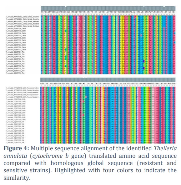These results are consistent with findings made by Mhadhbi et al., [24] and Chatanga et al., [25]. They discovered an identical mutation at codon 143. They also discovered that fifty isolates had mutations at codons 129 (18/50) and 227 (3/50), but some positions in all examined sequences had no alterations. The resistant isolate (JQ308839) had the proline (P) 253 and serine (S) mutation, but the sensitive isolate (JQ308837) had no mutations. All discovered mutations suggest a more error-prone nature of this gene, according to Goodman et al., [26], who underlined that the cytochrome b gene is encoded by many copies on the mitochondrial genome, and the mitochondrial polymerase enzyme has low fidelity.