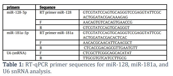 Special primers exist for measuring microRNA expression quantities. Table 1 contains the sequences that demonstrate the use of RT primers during reverse transcription steps alongside forward and reverse PCR primers required for amplifying miR-181a-5p, miR-128-3p, and U6 (snRNA). U6 (snRNA) operated as a built-in control reference for normalization purposes. This table presents abbreviations and sequences for Reverse Transcription and Forward and Reverse primers used in Polymerase Chain Reactions on Homo sapiens small nuclear RNA and Homo sapiens sequences