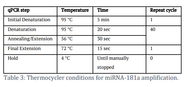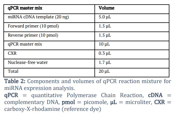 Table 2 displays the composition of the qPCR master mix, which was utilized for miRNA expression quantification. The master mix composition for qPCR reactions included 20 µL of solutions containing specific concentrations of template cDNA, together with primers and other necessary constituents. The thermocycler protocol mentioned in Table 3 was used after loading the qPCR plate.
