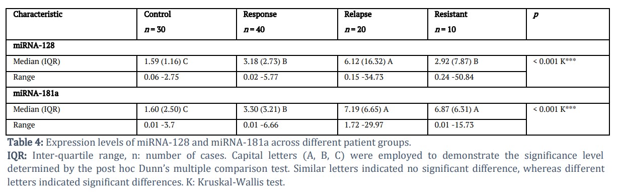 Results: The expression analysis revealed significant differences between the study groups for both miRNA-181a and miRNA-128 (p < 0.001). The highest peak level of expression was noted in the relapse group in comparison to the response, resistant, and control participants. Furthermore, in relapse, response, and resistant groups, there was significantly elevated expression (p < 0.05), and control levels were lowest of all (p < 0.05).