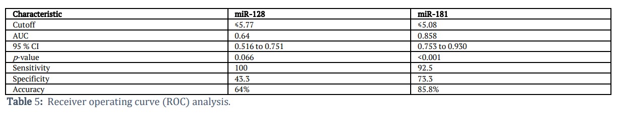 Total RNA was extracted from whole blood samples using the TRIzol kit according to the manufacturer's guidance. The RNA quality and concentration were measured by a spectrophotometer, which measured absorbance at 260/280 nm. After extraction, cDNA synthesis for miRNA-128 and miRNA-181a was conducted using the cDNA master mix. The qPCR master mix was prepared by using the GoTaq® qPCR Master Mix Promega kit, which was dependent on SYBR Green dye detection of gene amplification in the Real-Time PCR system.