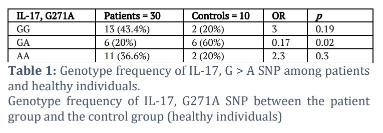 The present results of the study revealed the frequency of the genotype (Genotype frequency of IL-17, G > A SNP) between the patient group and the healthy group. The frequency of the genotype GG was 13 in the group of patients, with a percentage of 43.4%, while in the control group, the number was 2, with a rate of 20%, as there was no statistically significant difference (p = 0.19). As for the pattern GA, the number of cases in the patient group was 6 cases, with a rate of 20%, and the control group had 6 cases, with a rate of 60%, where the difference was statistically significant (p = 0.02). As for the genotypic pattern AA, its frequency was 11 in the sick individuals’ group with a percentage of 36.6%, while in the healthy group it was 2, with a percentage of 20%, as there was no change that is statistically significant (p = 0.3) according to Table 1.