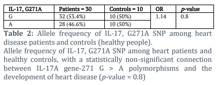 Allele frequency of IL-17, G271A SNP among heart patients and healthy people has a statistically non-significant connection between IL-17A gene, G271A polymorphisms and the development of heart disease (p-value = 0.8), as shown in Table 2.