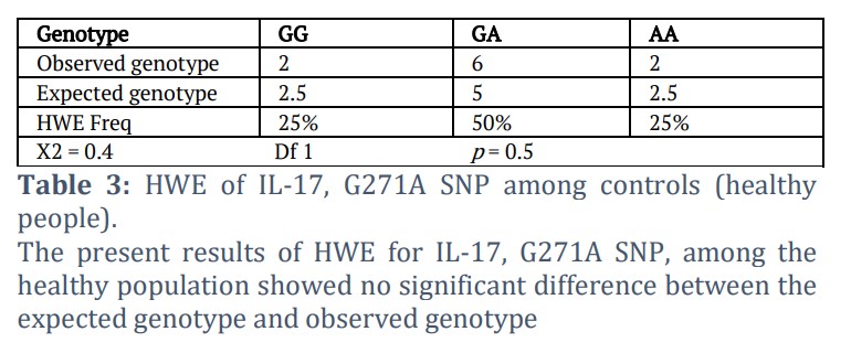 A basic theory known as the Hardy-Weinberg equilibrium (HWE) holds that, without unfavorable circumstances, a population's genetic diversity would remain constant over the course of many generations. To compute HWE, the genotype and allele frequency of the IL-17, G271A SNP are provided in Tables 1, 2, and 3. The genotype distribution in the control group was in Hardy-Weinberg Equilibrium (p > 0.05), as shown in Table 3.