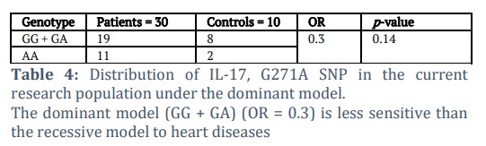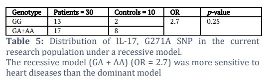 According to the distribution of IL-17, the G271A SNP in this research population under recessive and dominant models (Tables 4 and 5) showed non-significant results, so the recessive model (GA + AA) (OR = 2.7) was more sensitive to heart diseases than the dominant model.
