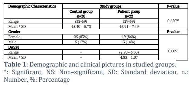 Based on the comparison of 22 RA patients with 30 healthy controls, the findings of this study were determined. Table 1 lists the demographic characteristics of patient group and control group. Age differences among the two study groups weren't significant (p>0.05). The average age of the participants was 46.91±7.49 years, and a significant gender difference (p <0.05) was found between the two study groups. Most of the participants of the RA patients were females: 19 (86%) compared to 3 (14%) male participants. The average DAS28 score for the group of RA patients in our study was 4.83 ± 1.07, considering disease activity at the time of diagnosis.