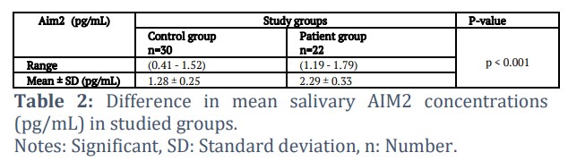 Results: AIM2, IL-18, and IL-33 levels in saliva were considerably higher in the patient group than in the control group.