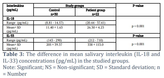 In the current study, there was significant elevation in mean salivary levels of IL-18 (p < 0.001) and IL-33 (p = 0.001) among RA patients (26.30±4.23 and 338.1±153.0) as compared to the control group (11.40 ± 1.63 and 205 ± 39.37), as observed in Table 3.