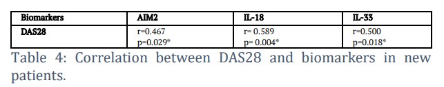 The current study showed that there was a significant correlation between DAS28 index at the time of diagnosis and salivary level of AIM2, IL-18 and IL-33 (r=0.467, P=0.029; r=0.589, p=0.004; r=0.500, p=0.018) in RA patient group as shown in Table 4.