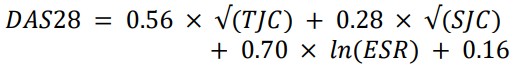 According to DAS 28, each candidate in the patient group received a score for disease activity. This index includes three measurements: an ESR measure (as a marker of inflammation), a TJC (tender joint count) range of 0-28, and an SJC (swollen joint count) range of 0-28. The following equation was used for calculating DAS28: