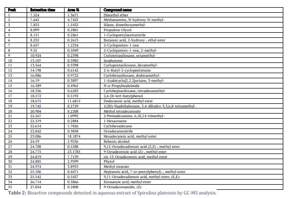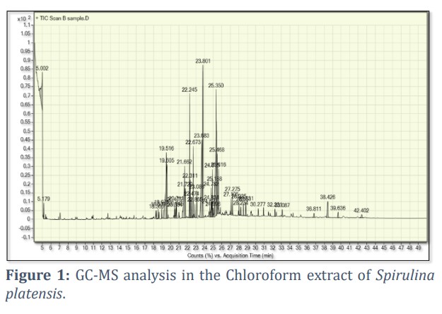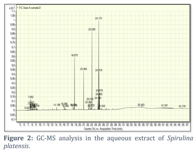 The occurrence of several bioactive compounds was established by the GC-MS analysis in both chloroform and aqueous extracts of Spirulina platensis, which were compared against the NIST library and standard references for compound identification [12]. The chloroform extract showed a broader chemical diversity (84 compounds) than the aqueous extract (35 compounds), as detailed in Figures 1 and 2 and Tables 1 & 2. Major constituents in the chloroform extract included hexadecanoic acid, ethyl ester (14.77%), neophytadiene (9.90%), oleic acid (6.87%), (E)-9-octadecenoic acid, ethyl ester (4.56%), and phytol (3.10%). The aqueous extract contained dominant compounds such as 9-octadecenoic acid methyl ester (23.17%) and hexadecanoic acid methyl ester (18.18%). These results align with the findings of El Din SM (2019) [13].