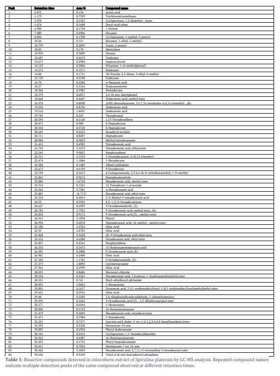 GC-MS analysis conducted for both chloroform and aqueous extracts of Spirulina platensis indicated that the chloroform extract contained 84 bioactive compounds, while the aqueous extract contained 35 compounds, as shown in Figures 1 and 2. nitial GC-MS output revealed repeated detections of certain compounds (e.g., oleic acid, neophytadiene, dodecanoic acid) at multiple retention times. To maintain transparency in data presentation, compounds detected at multiple retention times were retained as separate entries. These repeated names reflect distinct GC-MS peaks of the same compound rather than mathematically consolidated values. The major constituents in the chloroform extract were hexadecanoic acid, ethyl ester (14.77%), neophytadiene (9.90%), oleic acid (6.87%), (E)-9-octadecenoic acid, ethyl ester (4.56%), and phytol (3.10%). Detailed identification and area percentage of each compound are listed in Table 1, and representative chemical structures are shown in Table 2. In contrast, the aqueous extract had significant amounts of 9-octadecenoic acid, methyl ester (23.17%), hexadecanoic acid, methyl ester (18.18%), dodecanoic acid, methyl ester (11.68%), and methyl tetradecanoate (8.22%).