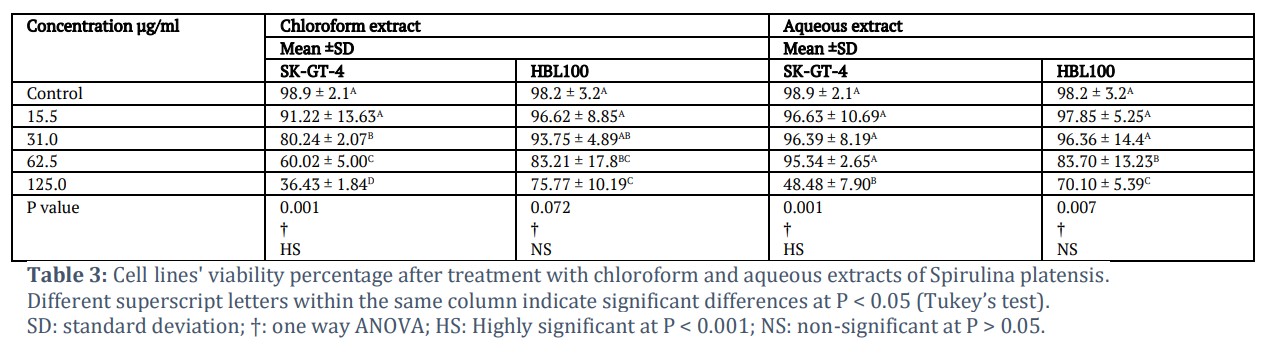 Furthermore, studies demonstrated the cytotoxic effect of Scenedesmus sp. and S. obliquus extracts against HepG2, MCF7, and CT116 cancer cell lines [26,27]. The presence of fatty acid esters enhances the biological activity of algal extracts [28,29]. Aqueous extract treatment also influenced cell viability, albeit to a lesser extent. Only the highest concentration (125 µg/ml) significantly reduced viability in SK-GT-4 cells (Table 3), with an IC50 value of 72.84 µg/ml. HBL100 cells showed a more marked viability reduction at concentrations ≥ 62.5 µg/ml (Table 3). These results agree with Abo El-Sayed B (2022), who observed modest anticancer activity in aqueous extracts [30], and with MZ MS (2012), who validated the anticancer potential of microalgae [14]. Bioactive constituents in the aqueous extract include methenamine, N-hydroxy-N-methyl, methyl tetradecanoate, phytol, behenic alcohol, and 9-octadecenoic acid (Z)-methyl ester [31]. These compounds likely contribute to the extract’s cytotoxicity. As indicated by the spectrum of alcohols, phenols, esters, and fatty acids identified, these components may be responsible for modulating anticancer effects [32]. This suggests that crude extracts of Spirulina platensis could serve as valuable resources for anticancer drug development.