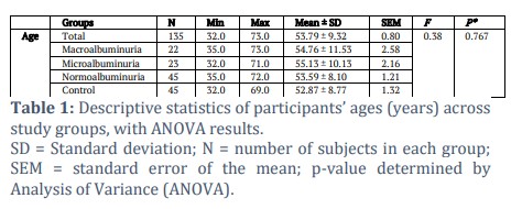 The age means ranged from 54.76 ± 11.53 to 55.13 ± 10.13 for macroalbuminuria and microalbuminuria, respectively, while the age for the Normoalbuminuria group was 53.59 ± 8.10. For control, it was 52.87 ± 8.77. The variation in age among the groups was not significant, as indicated by the ANOVA statistic, F (3, 131) = 0.38, p = 0.767 (Table 1).