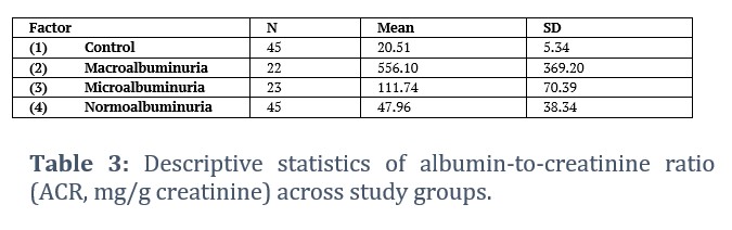For Macroalbuminuria, ACR had an average of 556.10 ± 369.20. For Microalbuminuria, ACR had an average of 111.74 ± 70.39. For Normoalbuminuria, ACR had an average of 47.96 ± 38.34. For Control, ACR had an average of 20.51 ± 5.34 (Table 3). The ANOVA results were significant, F (3, 131) = 70.25, p < 0.001, indicating that there were significant differences in ACR among the groups. This mean value is higher than the stated cutoff for normoalbuminuria (ACR < 30 mg/g), indicating a discrepancy between the group definition and the observed data. The results of multiple pairwise comparisons showed that the mean of the ACR for macroalbuminuria (556.10 ± 369.20) was significantly larger than for microalbuminuria (111.74 ± 70.39), p < 0.001; it was also significantly larger than for normoalbuminuria (M = 47.96 ± 38.34), p < 0.001; and it was also significantly larger than for control (p < 0.001).