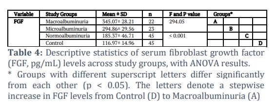 For Macroalbuminuria, FGF had an average of 345.07 ± 28.21; for Microalbuminuria, FGF had an average of 294.86 ± 29.56; for Normoalbuminuria, FGF had an average of 185.37 ± 46.71; for Control, FGF had an average of 116.97 ± 14.96 (Table 4). According to the ANOVA results, F (3, 131) = 294.05, p < 0.001, there were significant differences in FGF between groups. Multiple pairwise comparisons were made to see individual group differences as compared to Microalbuminuria (M = 294.86 ± 29.56), Normoalbuminuria (M = 185.37 ± 46.71), and Control (M = 116.97 ± 14.96). Macroalbuminuria's FGF mean had a significantly higher value (M = 345.07 ± 28.21), p < 0.001. Compared to normoalbuminuria and control, the mean of FGF for Microalbuminuria was significantly higher, p < 0.001. Normoalbuminuria's FGF mean value was also significantly higher than Control (M = 116.97 ± 14.96), with a p-value of less than 0.001.