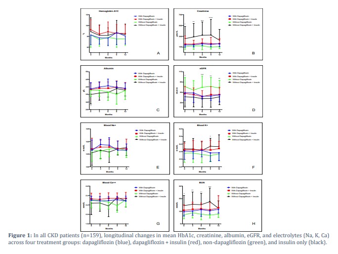 Methods: Adult diabetic patients with CKD who received 10 mg dapagliflozin once daily for 12 months were compared with another group on a glucose-lowering regimen without dapagliflozin. Data of HbA1C and kidney function tests, including eGFR, serum creatinine, blood urea nitrogen (BUN), sodium, potassium, calcium, and albumin levels were retrieved before starting dapagliflozin treatment and then every three months for a total of 12 months.