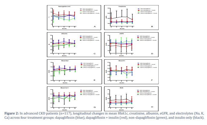 The blood electrolytes (Na, K, and Ca) remained relatively stable with minor variations across all groups in all CKD stages (Figure 1E, 1F & 1G) and advanced CKD stages (Figure 2E, 2F & 2G). However, potassium levels increased slightly over time, with more variability observed in the non-dapagliflozin groups.