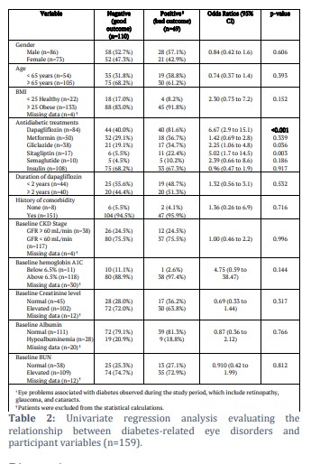 Finally, Table 2 presents a univariate regression analysis exploring the association between various participant variables and diabetes-related eye disorders among the study patients. 49 (30.8%) patients developed diabetes-related eye disorders, such as retinopathy, cataracts, and glaucoma. Gender and age do not show a significant association with the outcomes, as indicated by their p-values of 0.606 and 0.393, respectively. The analysis surprisingly revealed that dapagliflozin was significantly associated with a higher probability of eye disorders, with an odds ratio of 6.67 and a highly significant p-value of <0.001. Other treatments, such as gliclazide (OR 2.25, p = 0.036) and sitagliptin (OR 5.02, p = 0.003), were also significantly associated with bad outcomes.
