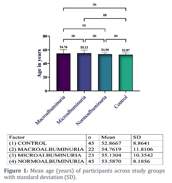 Among the 135 participants, 88 (65.2%) were male and 47 (34.8%) were female, with ages ranging from 32 to 73 years. The male was the most frequent gender within the Control group (n = 35, 25.9%), followed by the normoalbuminuric group (n = 26, 19.3%). There was no significant difference in gender distribution between the groups, χ²(3) = 6.66, p = 0.084. The age means ranged from 54.76 ± 11.53 to 55.13 ± 10.13 for macroalbuminuria and microalbuminuria, respectively. At the same time, the age for normoalbuminuria was 53.59 ± 8.10; for control, it was 52.87 ± 8.77. The variation in age among the groups was not significant, as indicated by the ANOVA statistics, F(3, 131) = 0.38, p = 0.767, which showed that the age discrepancies between the various levels of the group were all similar. Figure 1 depicts the means and 95% CI of means for each group.