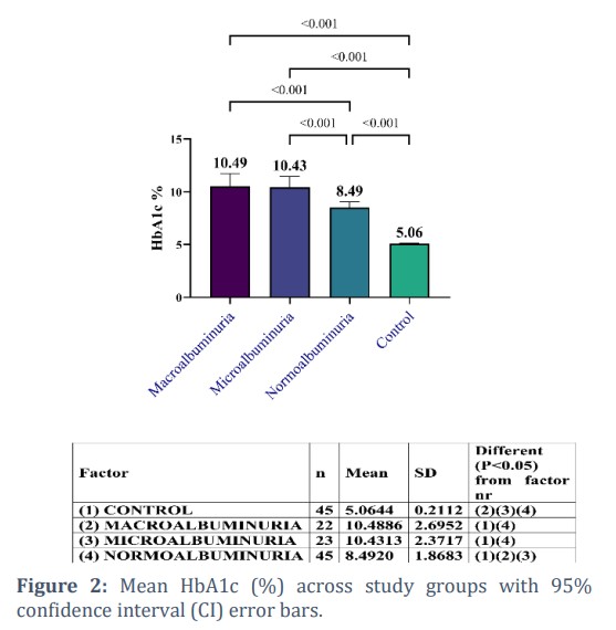 hand, the mean HbA1c for Microalbuminuria (M = 10.43 ± 2.37) was significantly higher than for both Normoalbuminuria (p < 0.001) and Control (p < 0.001). Lastly, the mean HbA1c (%) for Normoalbuminuria (8.49 ± 1.87) was significantly higher than for Controls (5.06 ± 0.21, p < 0.001). The means, standard deviations, and their comparisons are displayed in Figure 2.