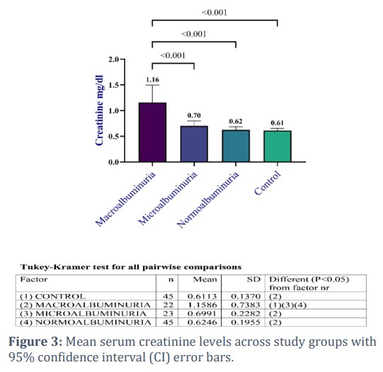 Serum creatinine (mg/dL) averaged 1.16 ± 0.74 in macroalbuminuria, 0.70 ± 0.23 in microalbuminuria, 0.62 ± 0.20 in normoalbuminuria, and 0.61 ± 0.14 in controls. The ANOVA results were significant, F(3, 131) = 14.95, p < 0.001, indicating significant differences in Creatinine among the groups. Multiple pairwise comparisons showed that the mean creatinine value for Macroalbuminuria (1.16 ± 0.74) was significantly greater than Microalbuminuria (M = 0.70 ± 0.23), where p is equal to 0.001, Normoalbuminuria (M = 0.62 ± 0.20), p = 0.001, and Control (M = 0.61 ± 0.14), p = 0.001; the means, standard deviations, and mean values comparisons are shown in Figure 3.