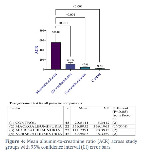 The albumin–creatinine ratio (ACR, mg/g creatinine) averaged 556.10 ± 369.20 in the macroalbuminuria group, 111.74 ± 70.39 in the microalbuminuria group, 47.96 ± 38.34 in the normoalbuminuria group, and 20.51 ± 5.34 in the control group. The ANOVA results showed a significant difference in ACR across the groups, F(3, 131) = 70.25, p < 0.001. The multiple pairwise comparisons showed that the mean of the ACR for macroalbuminuria (M = 556.10 ± 369.20) was significantly larger than for microalbuminuria (M = 111.74 ± 70.39), p < 0.001; it was also significantly larger than for normoalbuminuria (M = 47.96 ± 38.34), p < 0.001; it was also significantly larger than for control. The means, standard deviations, and compared mean values are shown in Figure 4.