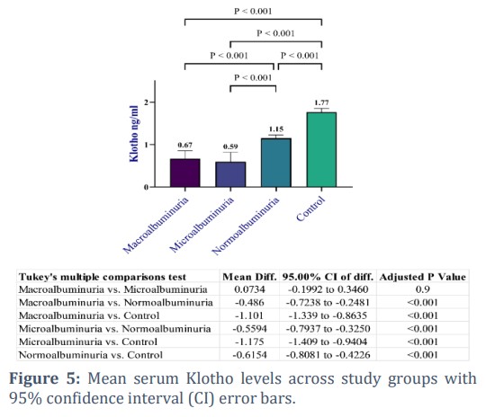 Multiple pairwise comparisons revealed statistically significant smaller Klotho mean values for Macroalbuminuria (M = 0.67, SD = 0.42) than Normoalbuminuria (M = 1.15, SD = 0.25), p < 0.001 and the Control (M = 1.77, SD = 0.29), p < 0.001, the latter two groups showed significantly higher Klotho mean compared to Microalbuminuria (M = 0.59, SD = 0.52). Also, the mean of klotho for Normoalbuminuria (M = 1.15, SD = 0.25) was significantly smaller than for Control (M = 1.77, SD = 0.29), p < 0.001. Figure 5 displays the results of ANOVA and means comparisons.