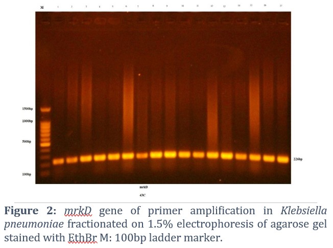 mrkD, a biofilm gene, was detected (Figure 2). Its specific primer revealed the gene's presence in 100% of K. pneumoniae bacterial isolates.