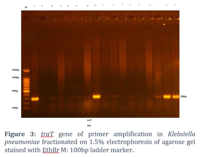 The current results are consistent with the results of Mirzaie et al., [26]. Where the presence of the traT gene in the isolates of the multi-drug-resistant K. pneumoniae bacteria MDR was 62%, it was found that 62 isolates out of 100 of the bacteria K. pneumoniae were carriers of this gene. The current results are inconsistent with those of El Fertas-Aissani et al., [24], where the results showed that one isolate out of 54 isolates of K. pneumoniae was a carrier of the traT gene at 1.8% (Figure 3).