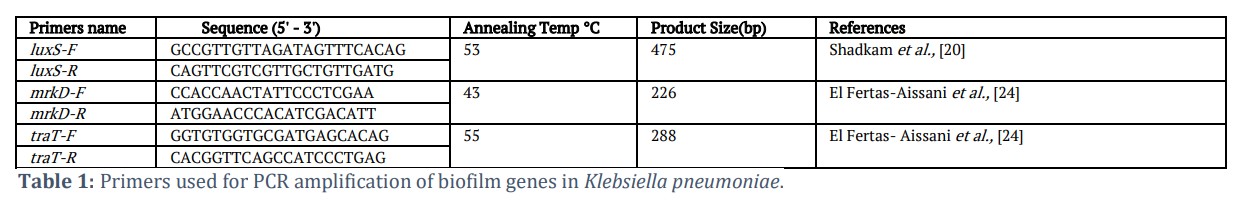 Klebsiella pneumoniae is a Gram-negative bacterium that is further categorized under the Enterobacteriaceae family. It is a capsulated, non-motile, facultative anaerobe, lactose-fermenting organism [1,2]. Among all the types of Klebsiella, Klebsiella pneumoniae is of the utmost significance. It is a normal resident of the human intestine and can cause many persistent infections such as urinary tract infections, Bacteremia, Purulent Liver abscess, wound infection, burns, and diarrhea. Therefore, Isolation and study of this bacterium are essential, as infants, older adults, and immunocompromised individuals are highly susceptible. However, the bacterium is also responsible for a growing number of community-acquired infections [1,3]. The mucous surfaces of the digestive system and pharynx are usually colonized in humans by these bacteria, and they can show high degrees of virulence and antibiotic resistance, where it is multi-resistant, meaning that it is resistant to more than one type or more than one group of antibiotics, and it is called Multidrug Resistance (MDR) [4,5]. The Klebsiella pneumoniae bacteria, which are highly virulent organisms, have the ability to form biofilms that enable them to cause chronic infections. This biofilm protects the bacteria from being phagocytosed and from the humoral and cellular immune responses, thus leading to persistent inflammation [6]. Biofilm formation has been documented in K. pneumoniae in 1988 [7]. Klebsiella pneumoniae is capable of biofilm formation: a phenomenon whereby cells adhere to and aggregate with other cells with the help of a matrix of polysaccharides, proteins, and DNA. These biofilms are of clinical importance on catheters and implanted devices and are known to colonize bodily tracts and cause severe infections in immunocompromised patients [8]. These bacteria often colonize hospital patients, complicating treatment and contributing to healthcare-associated infections, and biofilms are multiple or Monomicrobial formations that cause long-term infections that are problematic to treat and remove from the body. Most infections occur in hospitals due to contamination of medical equipment such as catheters and ventilators, which are coated with cellular components hosted on-site [9]. Genes involved in biofilm formation include mrkD, mrkA, fimH, and fimA, which enable adhesion [10]. One of the biofilm genes is the luxS gene, which belongs to QS quorum-sensing genes, and facilitates the production of biofilm. The transfer of genetic material between bacterial cells thus increases the resistance of bacteria to antibiotics [11]. The traT gene is another biofilm-producing gene in MDR Klebsiella pneumoniae that helps in conjugation and complement inhibition [12].