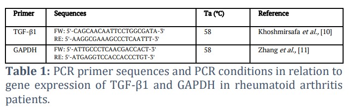 Peripheral blood samples were collected from patients diagnosed with RA and control individuals. Total blood RNA was extracted from patients and control individuals using the AccuZol reagent. The complementary DNA (cDNA) was reverse transcribed from RNA using an RT FDmix (Hexamer) kit, and the procedure was done in a reaction volume of 25 μL as per the manufacturer's instructions. cDNA was run in Real Time PCR for many cycles. The data were normalized to a housekeeping gene (internal control group), GAPDH. TGF-β1 expression gene was measured to detect the quantity of the above gene in patients and compared with healthy individuals as a control group using qPCR. The final volume used in RT-qPCR is shown in Table 2.