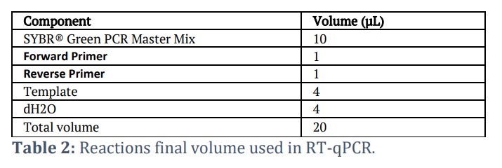 These components were the full reaction mixture composition used for quantitative real-time PCR analysis. To maximize the reaction, all reagents are used at their relative concentrations based on the final volume of the reaction: 20 μL per sample. A fluorescent detection system (SYBR Green PCR Master Mix, Applied Biosystems, USA) was used for amplification monitoring. The template is cDNA, which was made from the patient and control RNA samples.
